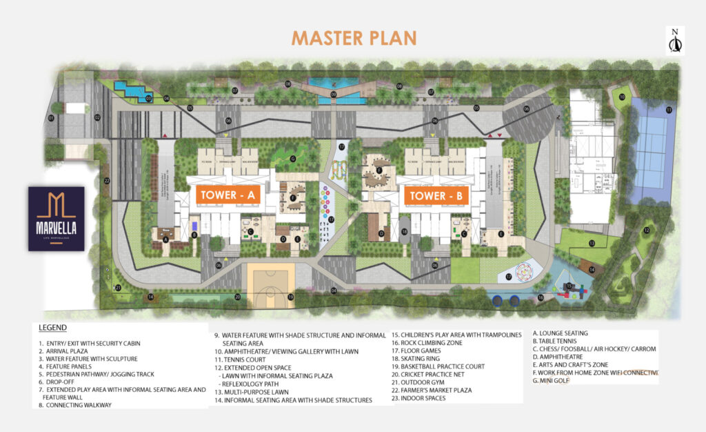Spread across 4.5 acres, Marvella redefines elegant living with 82% of its area dedicated to lush green, open spaces and thoughtfully designed amenities.